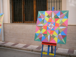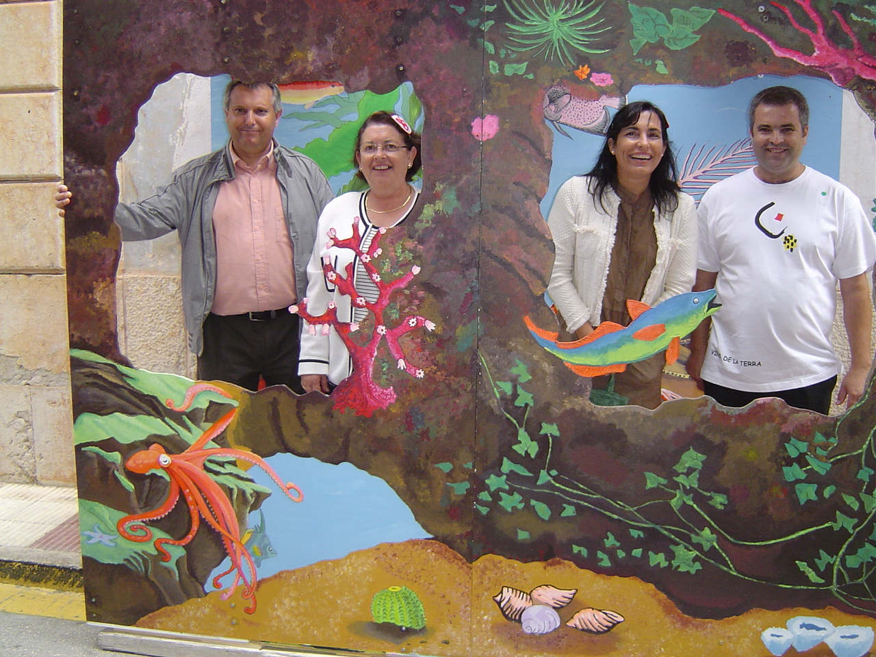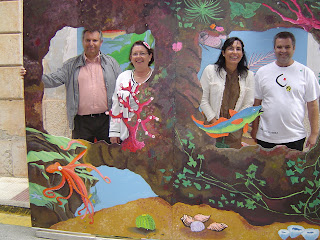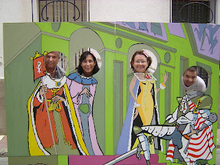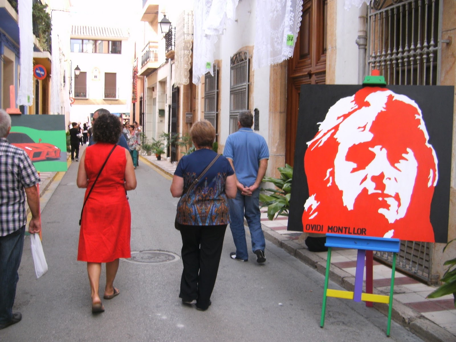 Los alumnos de arte del IES Gata de Gorgos también participaron liderados por el profe, Modest. En la calle Signes compartieron protagonismo con el concurso de colchas varias obras incluidas las pinturas para retrato en 3d en las que posan arriba la comitiva inaugural de la Feria.