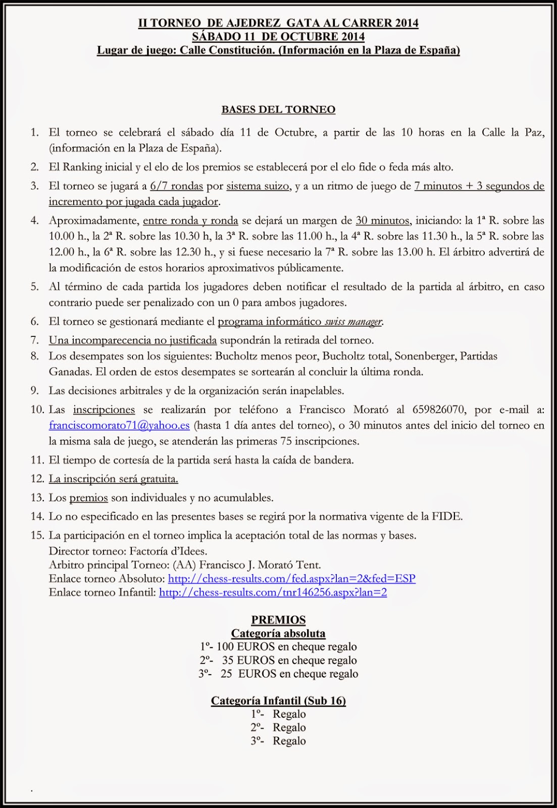 El torneo se jugará en 6/7 rondas por sistema suizo en la C/ Constitución a las 10h de la mañana